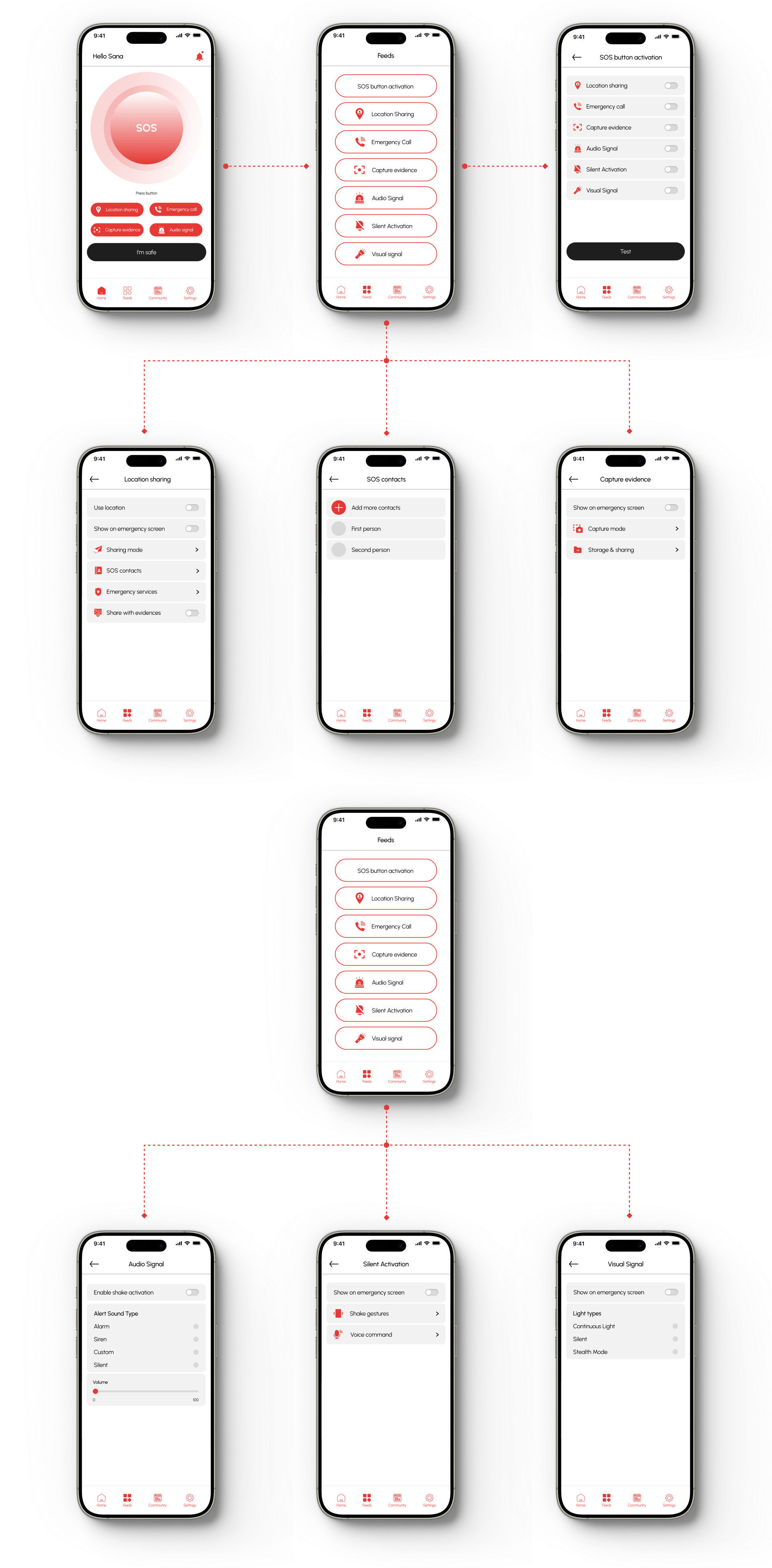 A discreet mode that allows users to trigger SOS without making any sound or visible alert. Silent activation can be enabled through hidden gestures, making it ideal for situations where drawing attention could increase risk.
